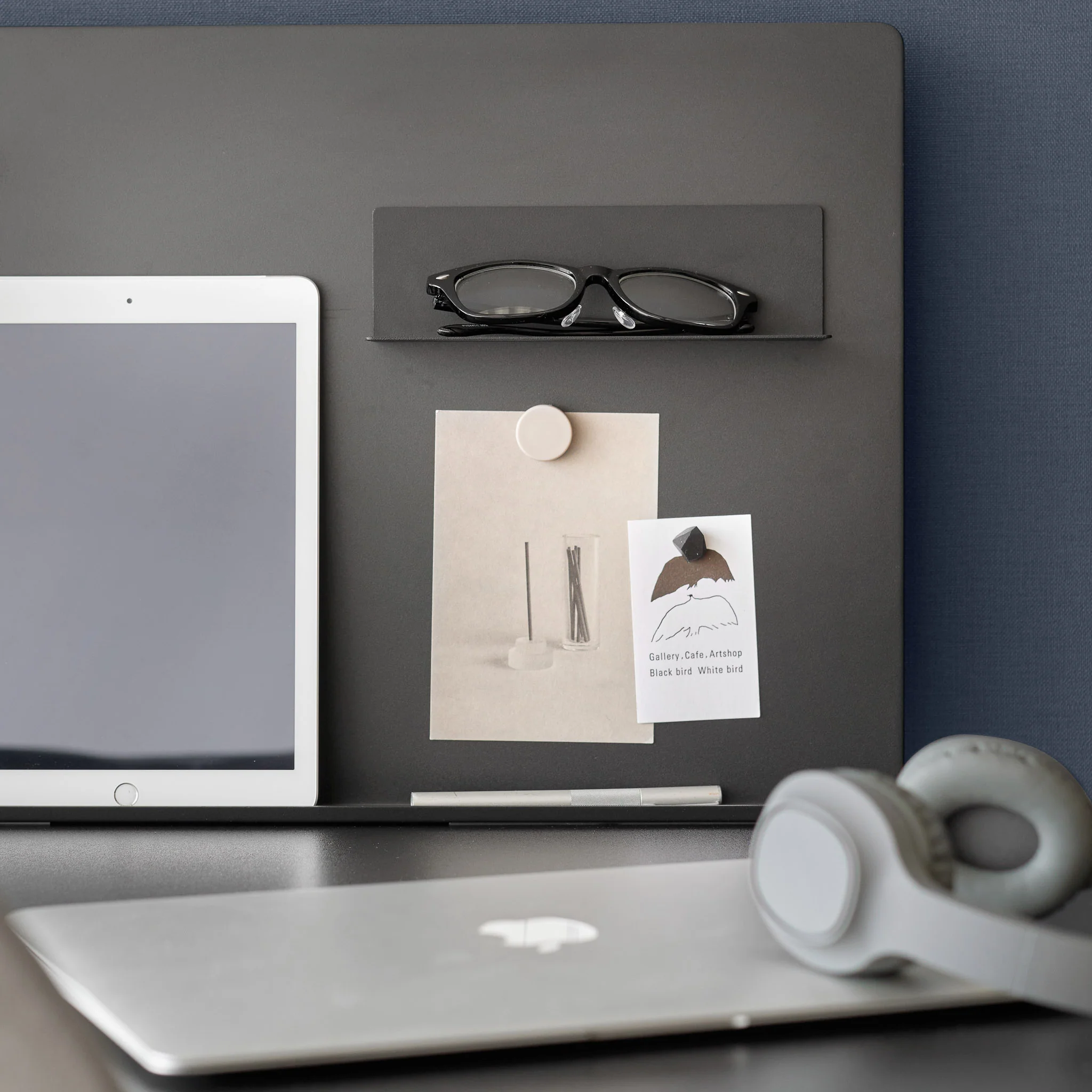 This shelf magnetically attaches to metal surfaces, such as the Magnetic Desk Panel, providing a practical storage space for small items. It supports both upright and upside-down mounting and ensures a strong, secure hold.