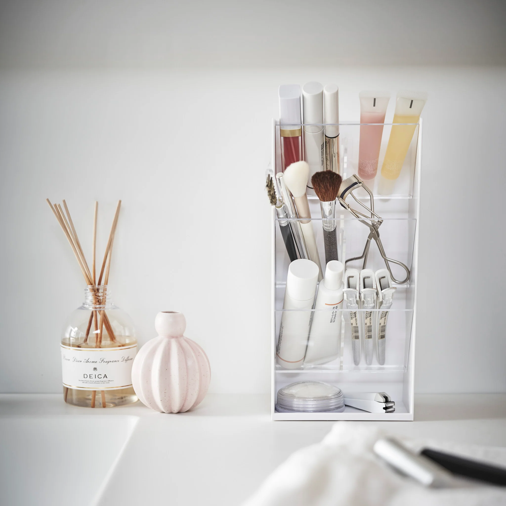 This storage case is perfect for organizing makeup and other small items space-efficiently. It comes with three storage compartments that can be adjusted in height and are transparent so that the contents are always visible.