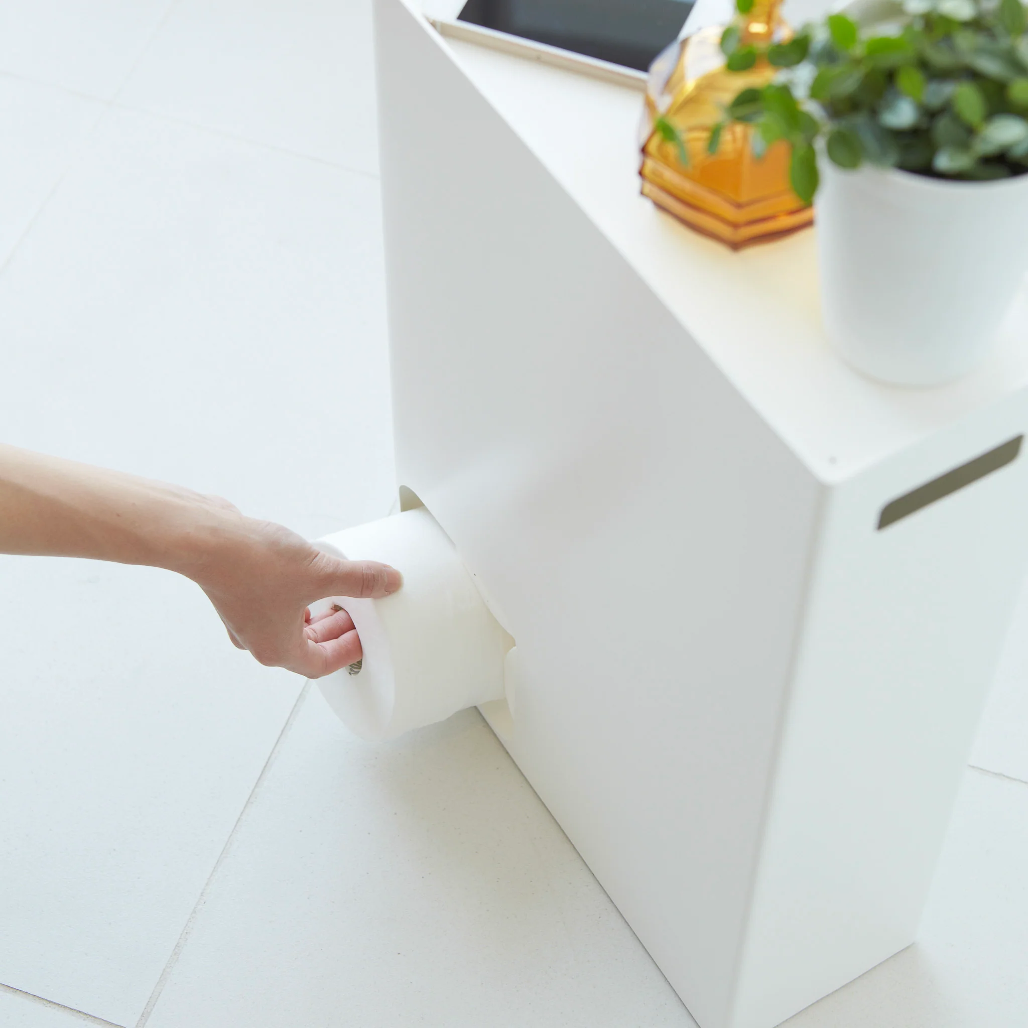 This toilet paper stocker holds up to 12 rolls and features a sloped design that dispenses the next roll when one is taken. Its slim shape fits easily into narrow spaces, and the top offers a convenient spot for small essentials.