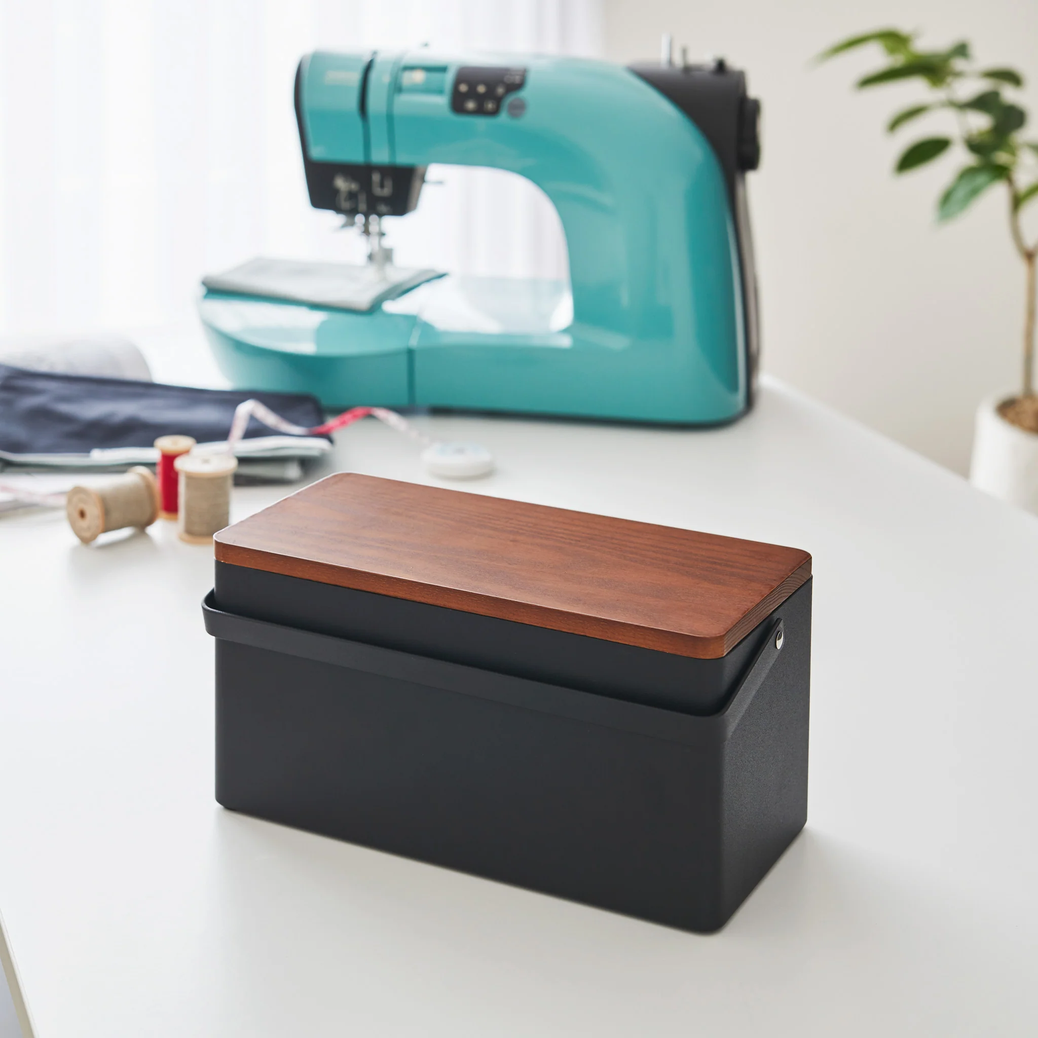 This storage box is ideal for organizing sewing tools and small items. It features a spacious main compartment and a sliding tray for extra storage. With a wooden lid and a practical handle, it combines functionality and style.