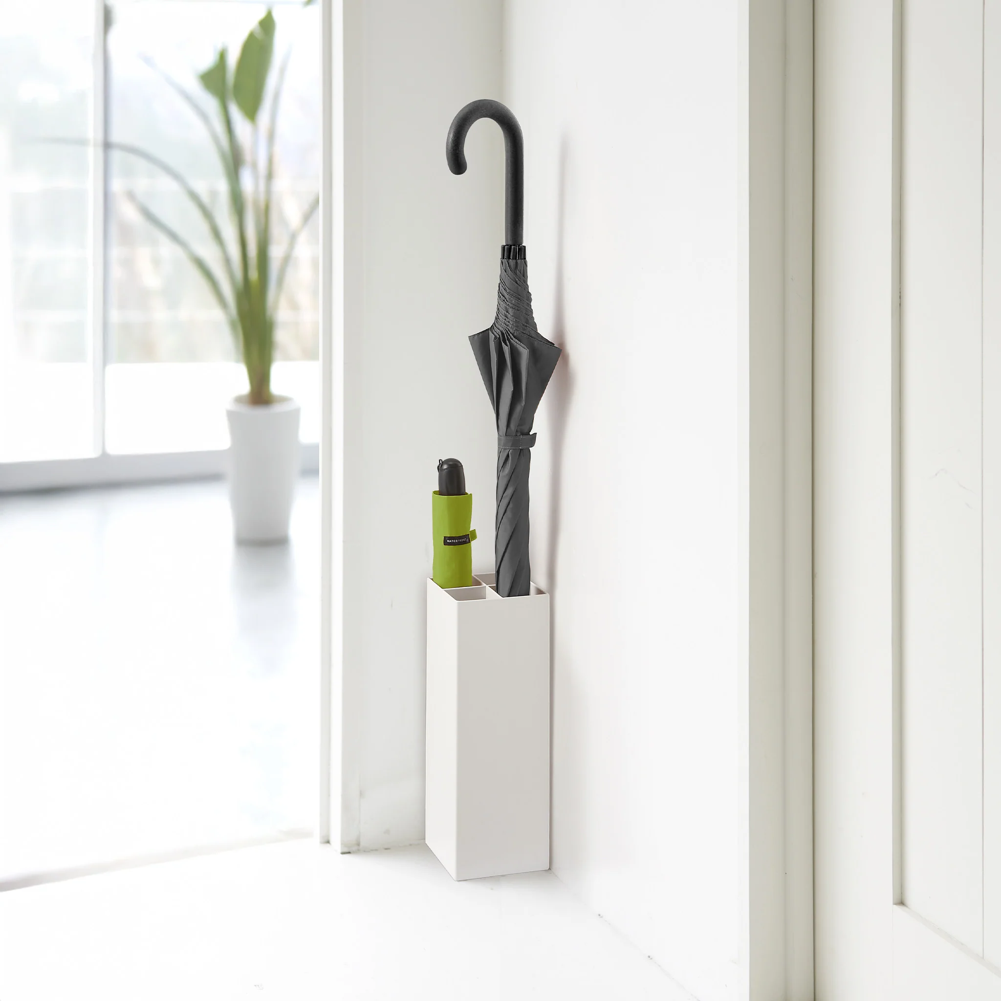 This umbrella stand features a simple design with two enclosed sides, making it ideal for discreet storage in room corners. A raised platform and adjustable drip trays offer versatile storage for both stick and pocket umbrellas.