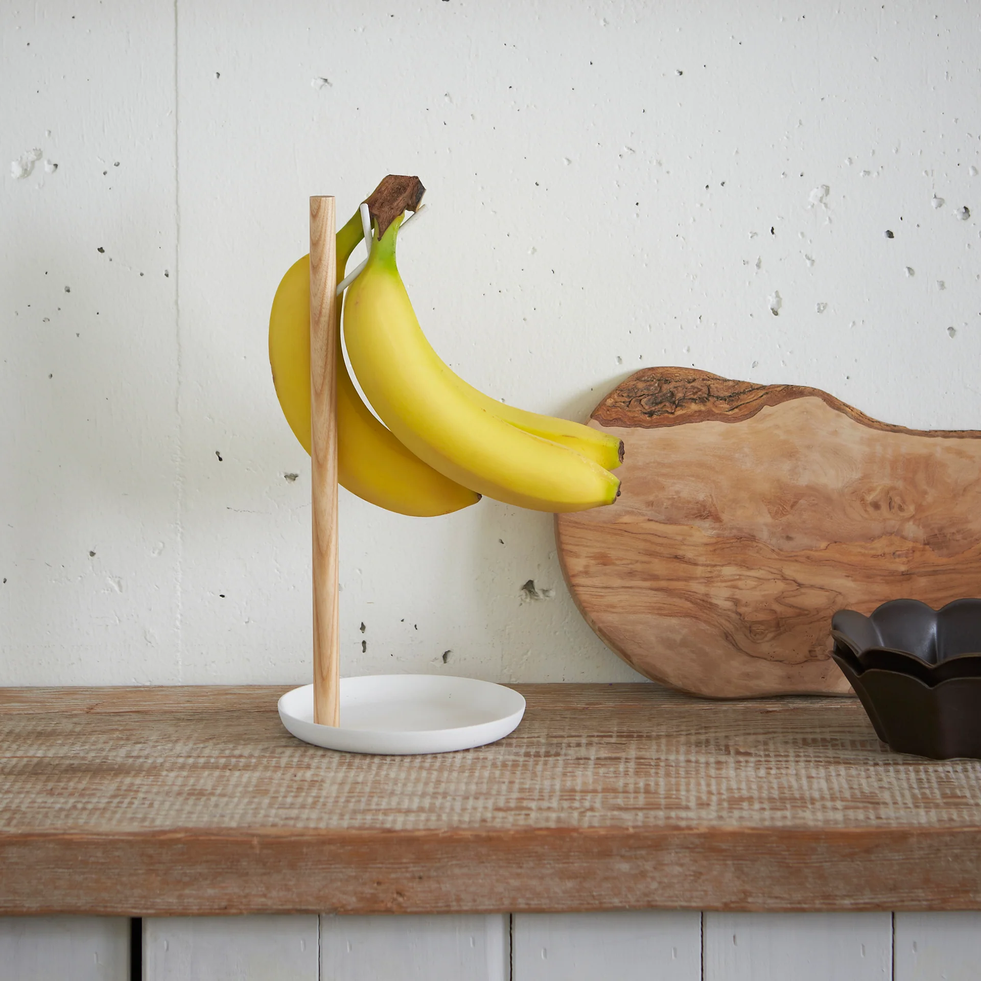 This banana stand is a stylish addition to any kitchen or dining space. Its sleek steel design, paired with a warm wooden stand, offers a dedicated spot for hanging bananas, keeping them fresh longer and preventing bruising.