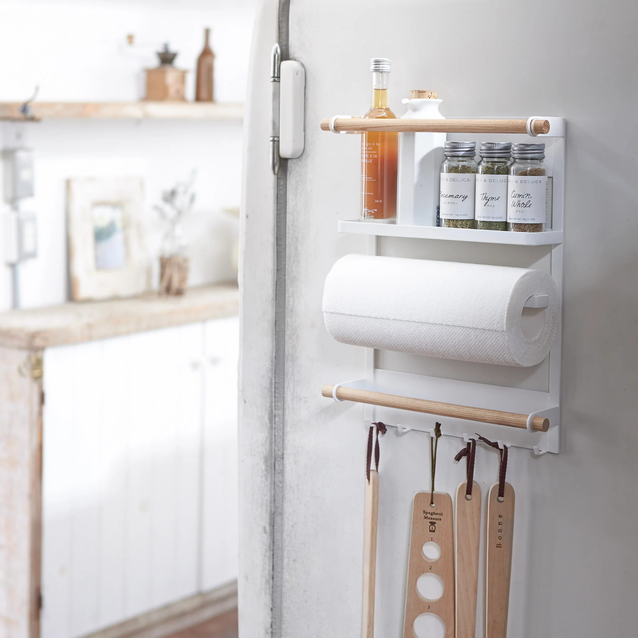 This rack attaches magnetically to a fridge or metal surface and offers convenient storage for kitchen essentials like paper towels and wrap foils. The bottom hook rail is perfect for hanging spoons, ladles, and other utensils.