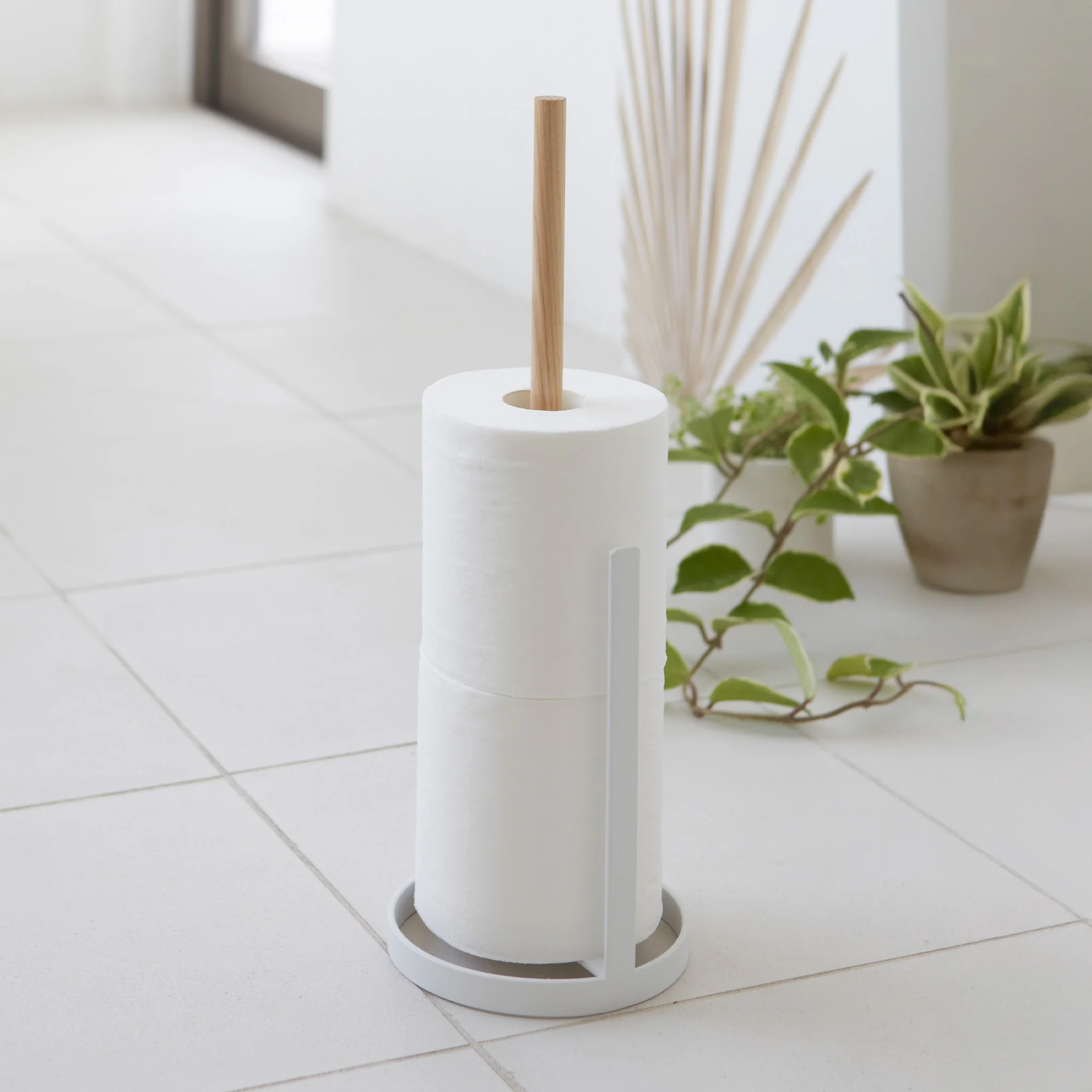This toilet paper stocker combines a simple, round design with a slim profile, making it perfect for smaller spaces. It holds up to three rolls and features a white steel frame paired with a wooden rod for a warm, stylish accent.