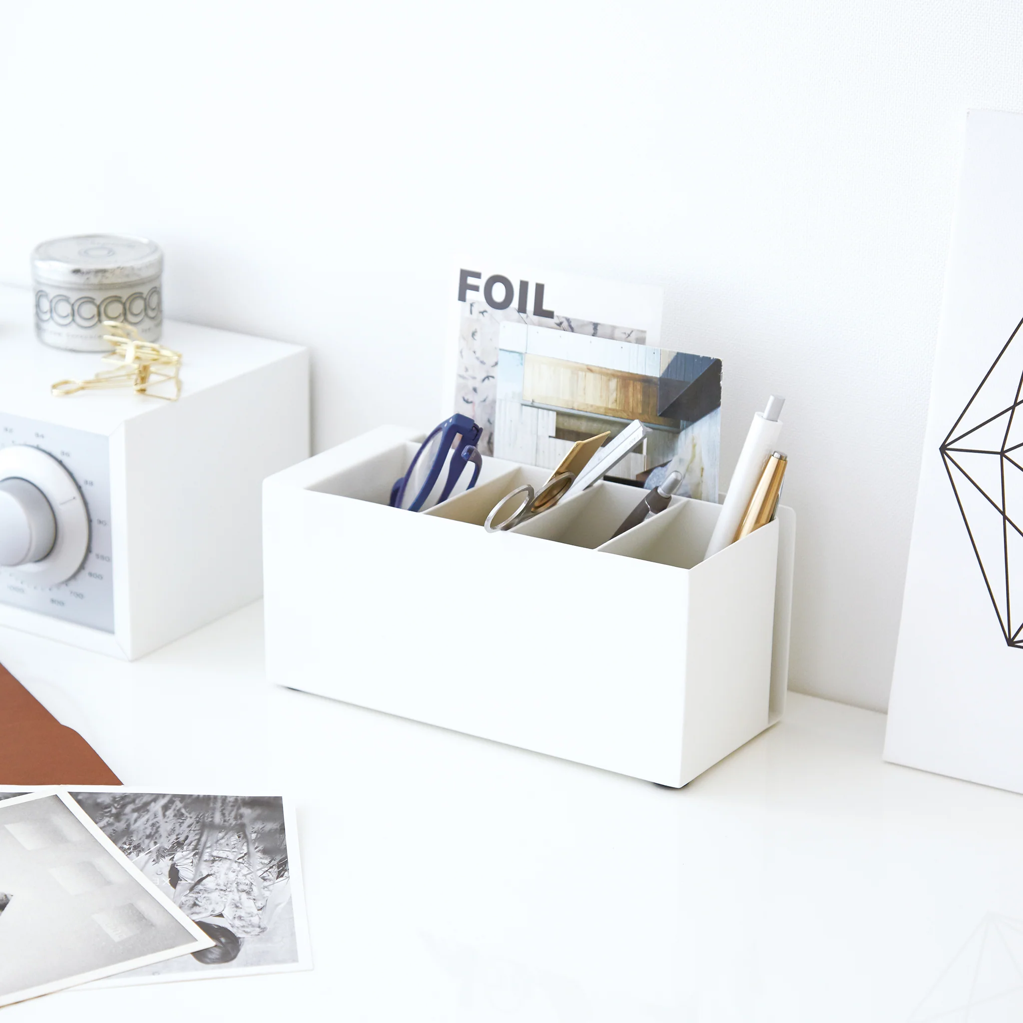 This pen stand features a clean, modern design and is made of steel for added stability. It can be positioned vertically or horizontally and has four compartments and a practical side pocket for storing pens and stationery.