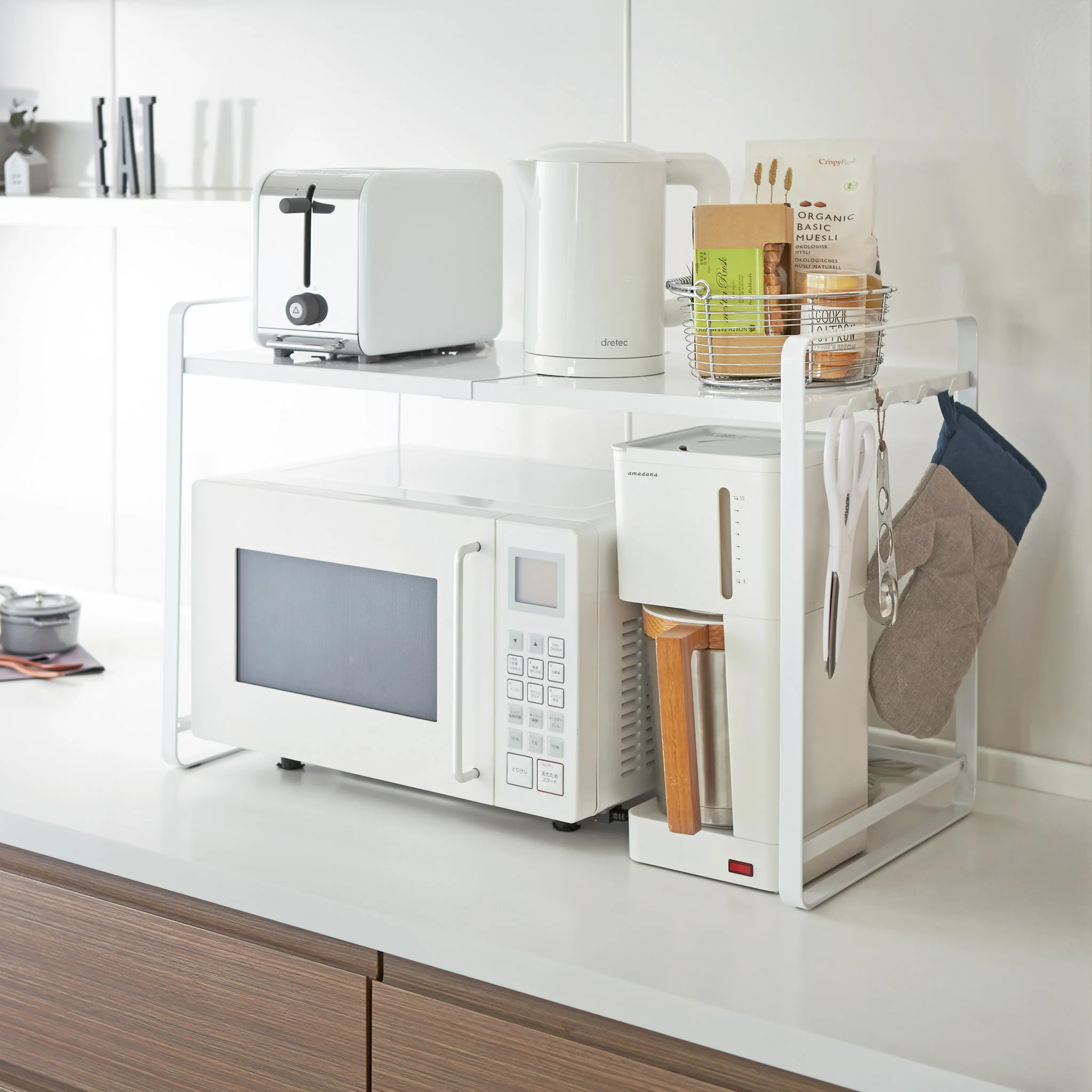 This rack is a versatile addition to any kitchen, perfect for creating a second tier of storage over bulkier appliances. It features hooks for hanging small items and an extendable design that adjusts seamlessly to fit any space.