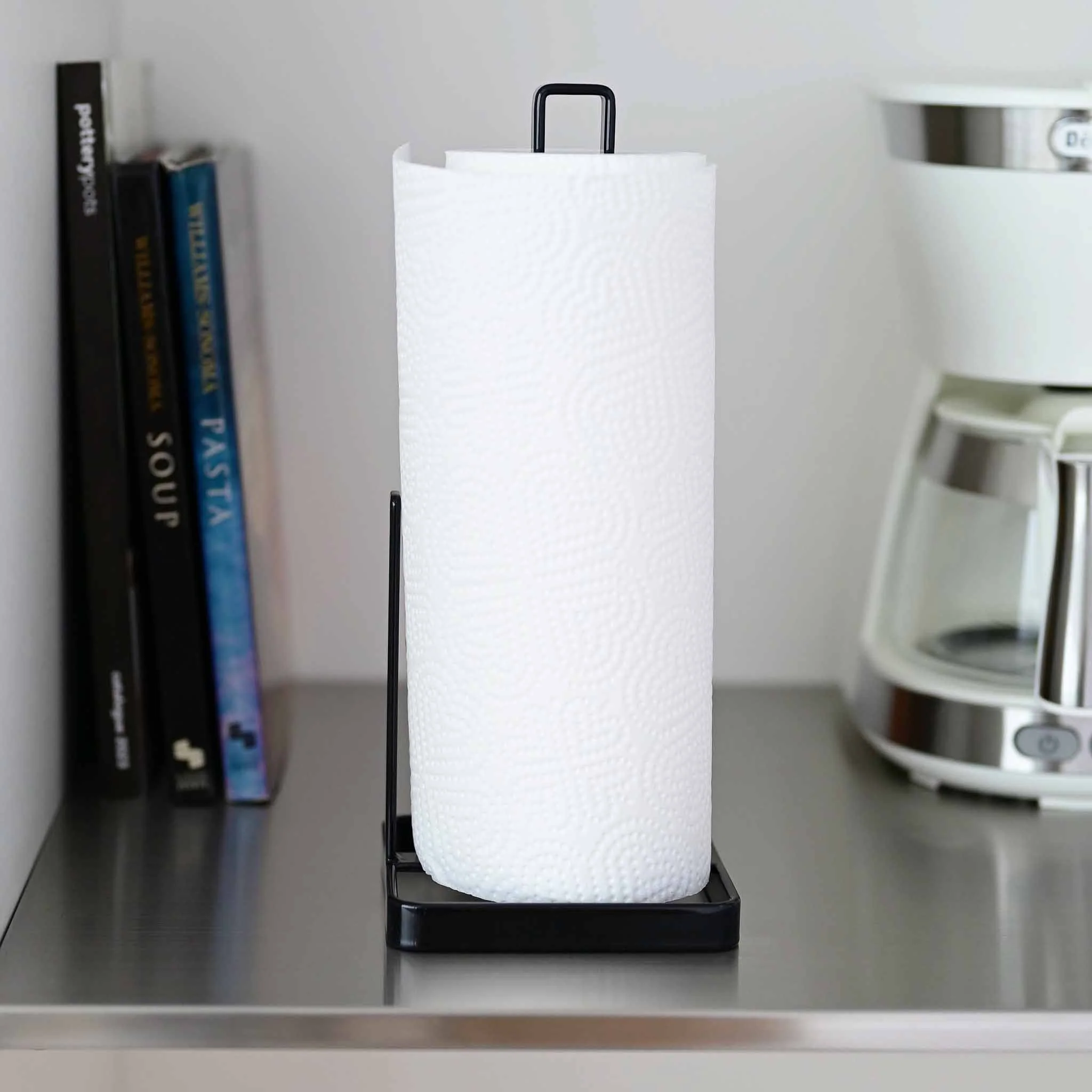 This paper towel holder, made of steel, combines style and functionality, making it a practical addition to any modern kitchen or dining room. Designed for stability, it ensures smooth and effortless tearing of paper towels.