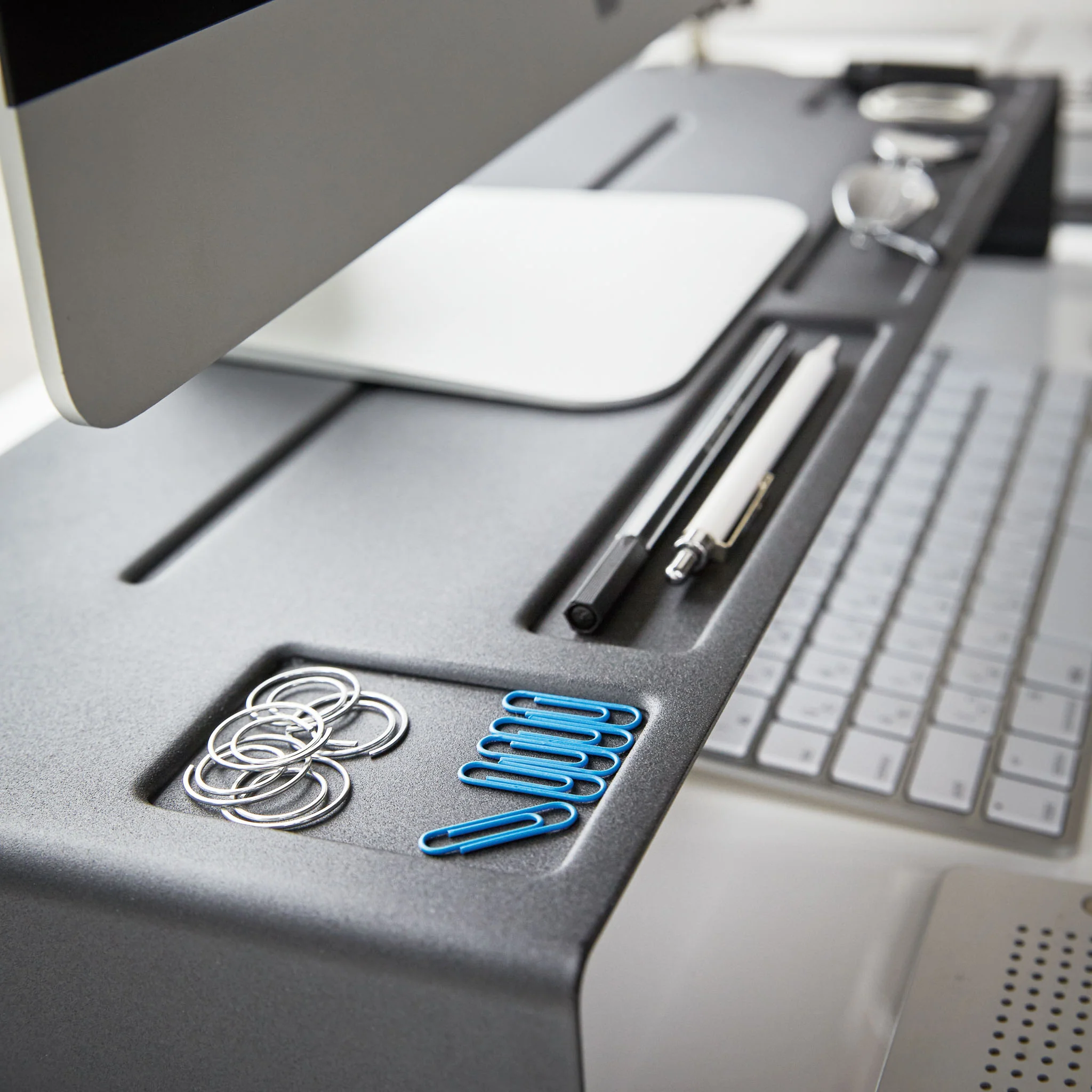 This stand is a practical desk addition and raises the monitor to a comfortable height. It features small indentations for storing stationery, and the open space underneath is perfect for stowing away a keyboard when not in use.