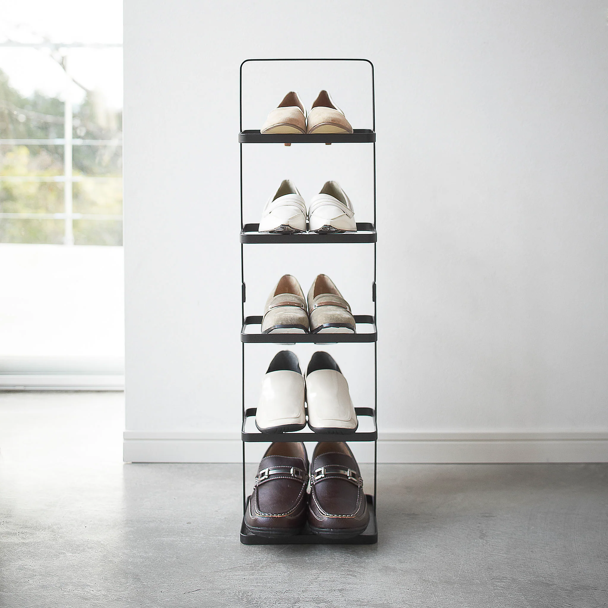 This steel shoe rack is designed for convenience and portability. It features a handle for easy movement and five tiers that accommodate up to five pairs of shoes. Its compact design makes it an ideal fit for narrow entryways.
