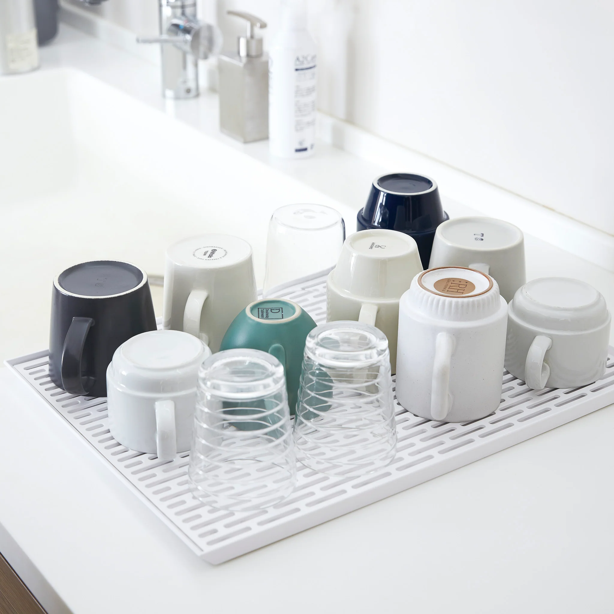 This drainer mat fits conveniently next to the sink, providing a space to store and drain dishes. It features a drain tray with a removable grid panel for easy cleaning and efficient water drainage.