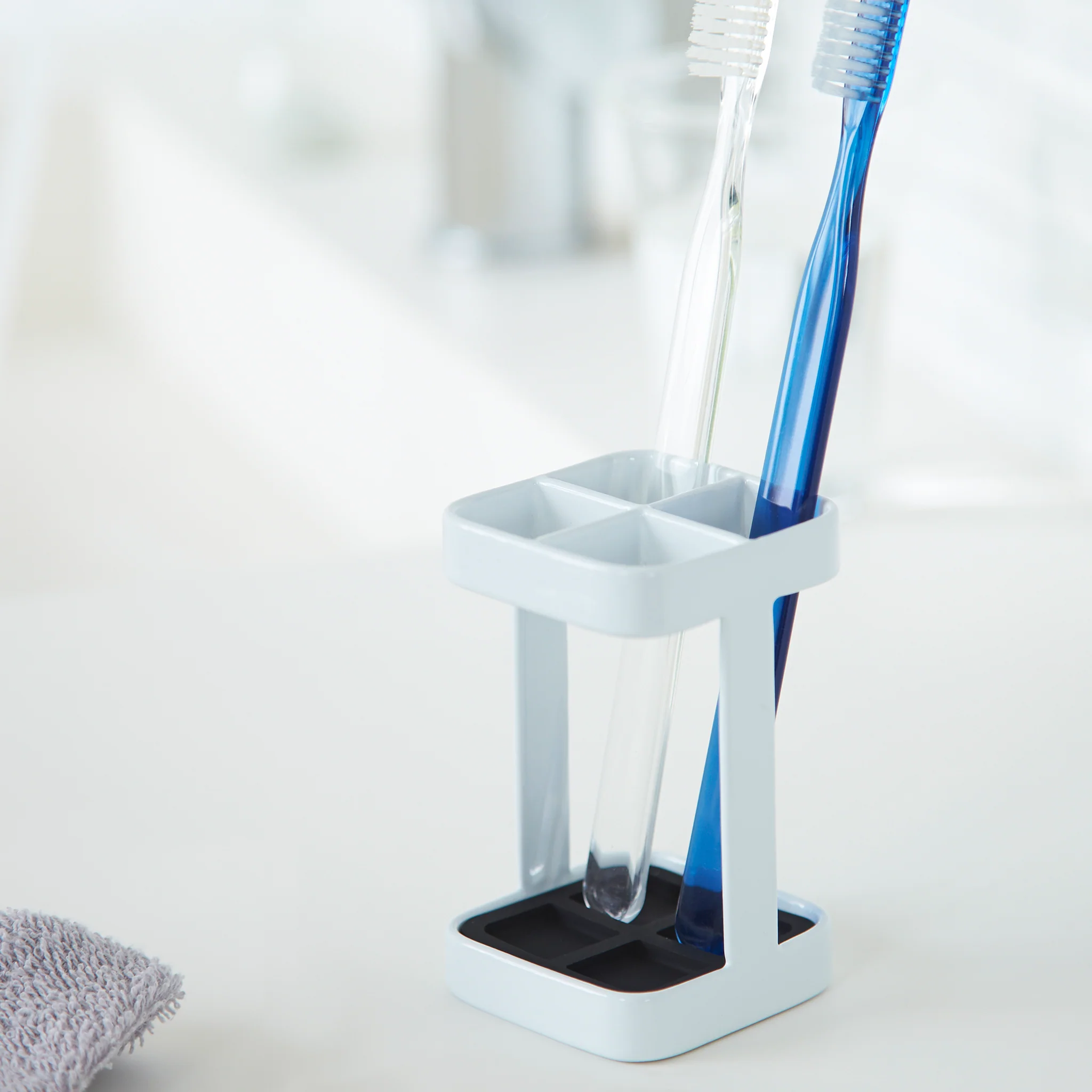 This toothbrush stand includes designated slots for four toothbrushes, and keeps them upright and separated for optimal hygiene. A removable bottom tray makes cleaning simple and effortless.