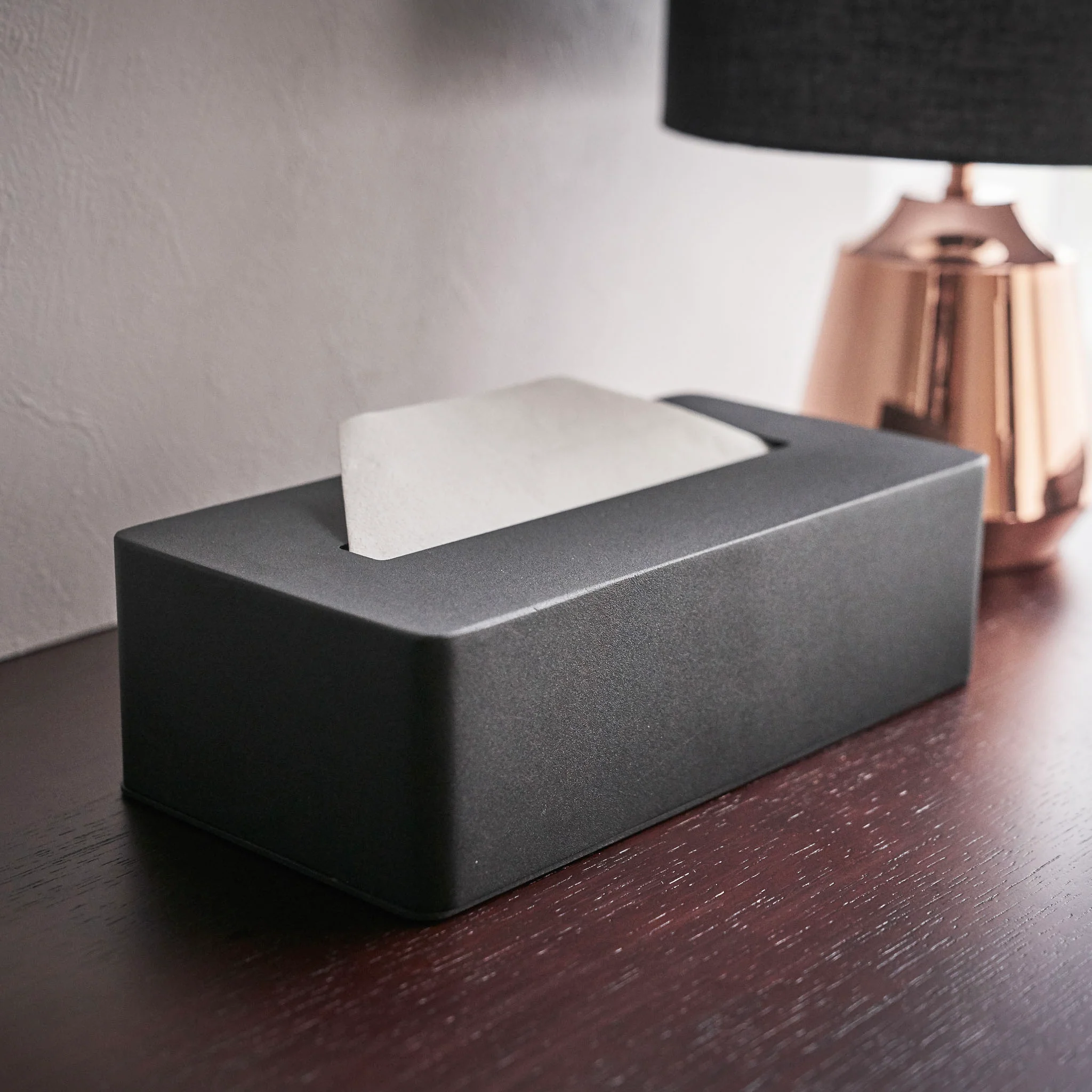 This tissue case features a modern design that suits any living or office space. The removable full-body cover allows easy refilling, while its sturdy steel construction and non-slip rubber pads provide stability during use.