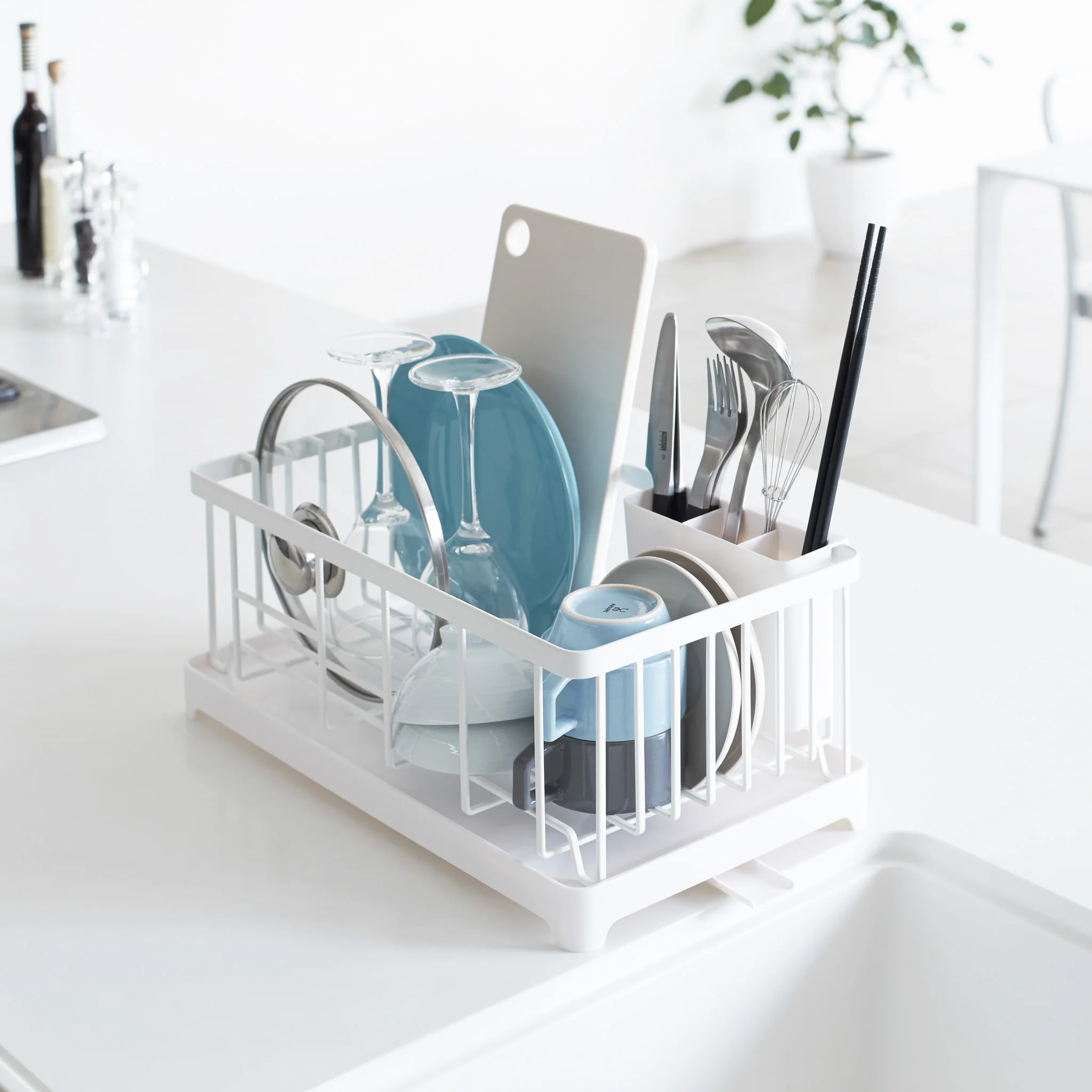 This drainer fits perfectly next to the sink, featuring a rotating drain that directs water back into the sink. The spacious basket accommodates a variety of dishes and can be removed from the bottom tray for convenient cleaning.