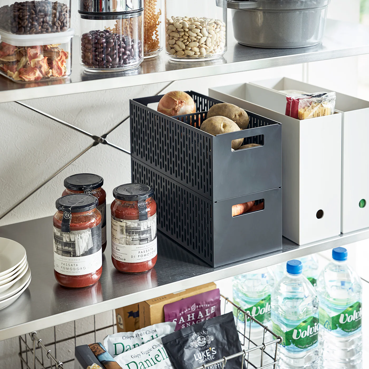This basket is ideal for the kitchen or pantry, offering ample space for vegetables and ingredients. It features an adjustable divider and is stackable for efficiency. The open mesh design promotes airflow to keep contents fresh.