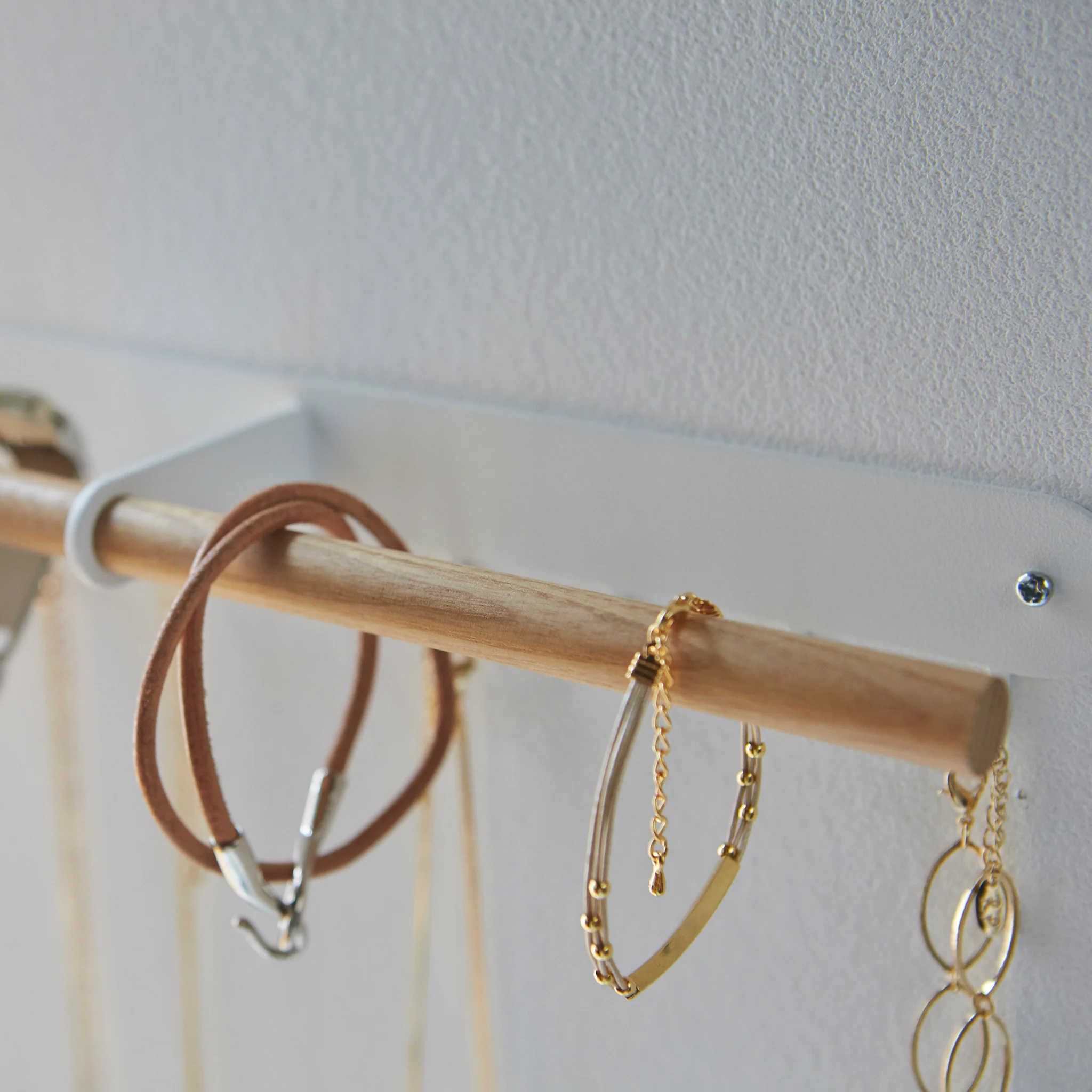 This rack provides a practical and stylish solution for organizing jewelry and accessories. It features a wooden bar and multiple hooks for storage and can be easily attached to walls an flat surfaces with the included screws.