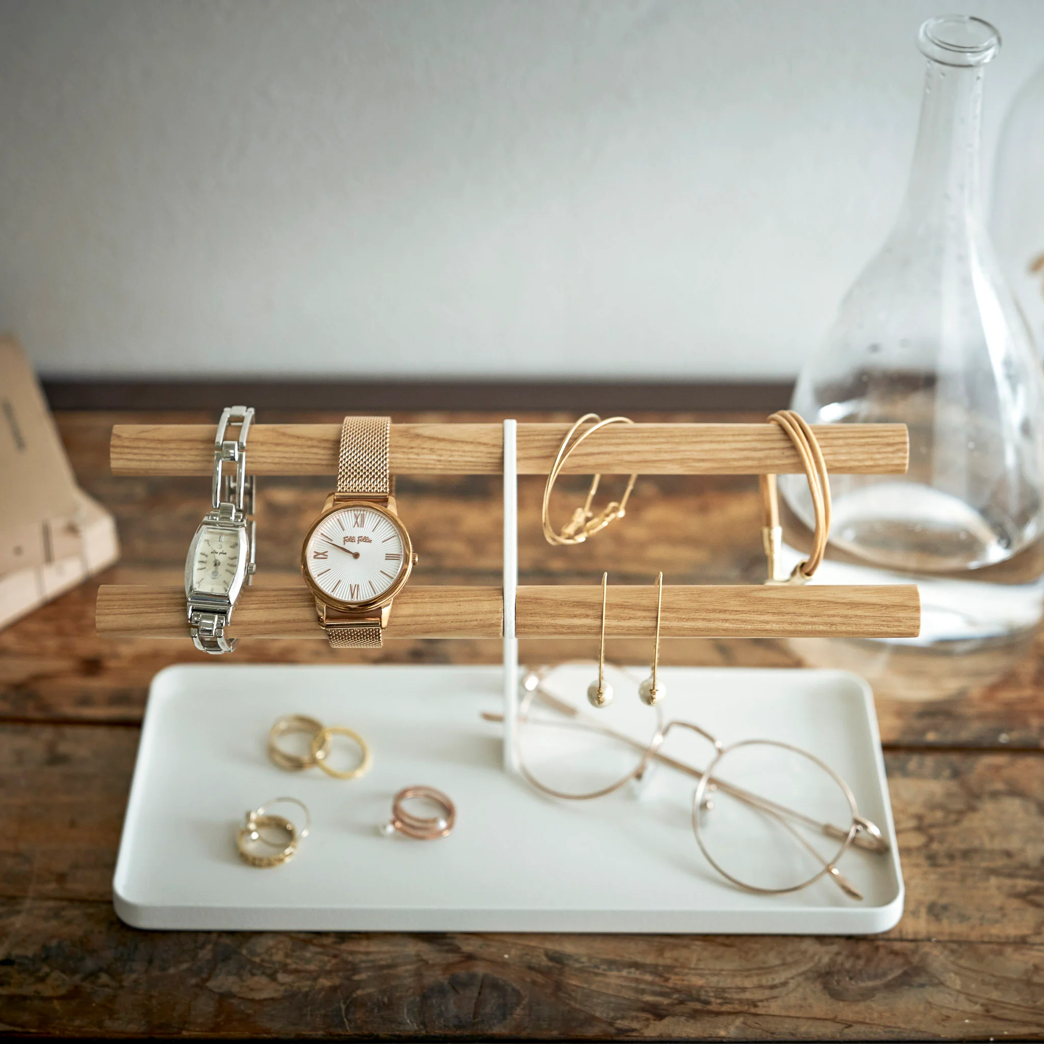 This stand is ideal for organizing and displaying jewelry and small accessories. With two wooden rods designed to securely hold wristwatches or bracelets, it combines practical storage with a sleek, decorative display.